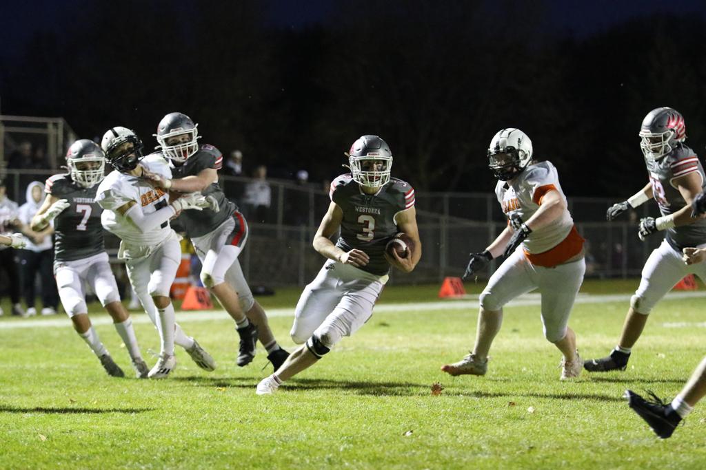 Minnetrista, MN – It had been a while since Mound Westonka was able to celebrate a playoff victory, but on Tuesday night they did just that while scoring on every meaningful possession in a 47-0 decimation of Delano in a Section 6AAAA Quarterfinal game at a windy Haddorff Field.
