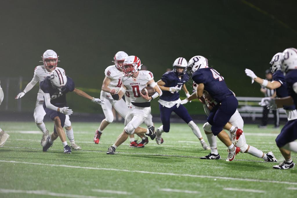 Westonka opened the game with a 73-yard drive, highlighted by a 54-yard pass to running back Blake Reinbold. Quarterback Cade Newell’s pass down the Orono sideline hit Reinbold in stride taking the ball down to the 20-yard line. The White Hawks would net eight yards on the next three plays, and after initially lining up for a field goal attempt, Westonka decided to go for it, but Newell’s pass was batted down in the end zone as he attempted the pass under heavy pressure.