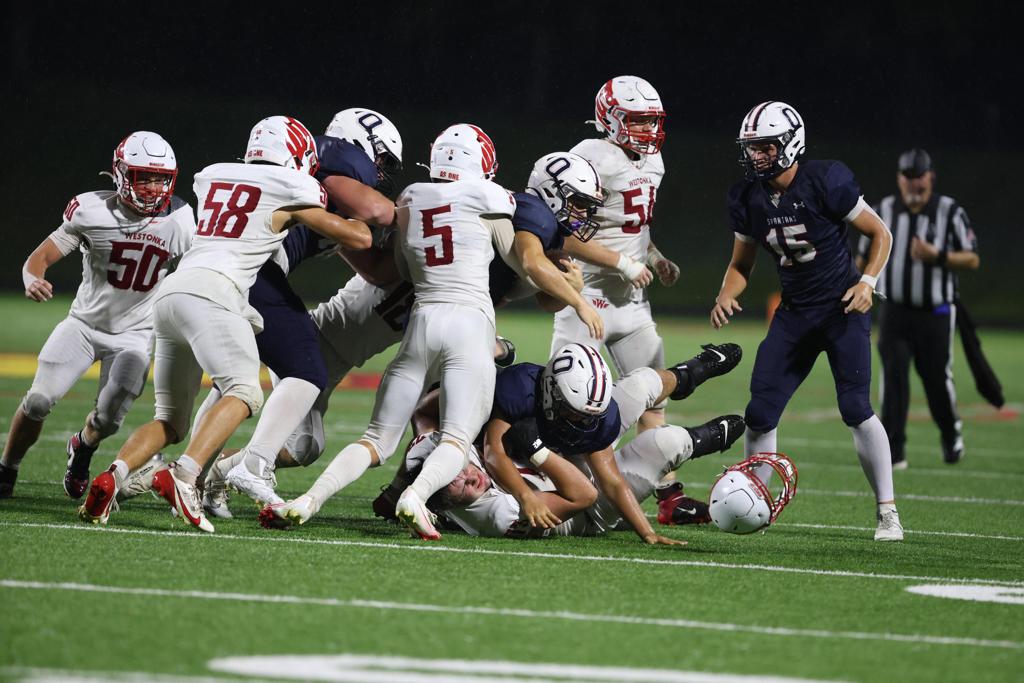 Every time the White Hawks offense seemed to get going they would get stopped by their own mistakes. Newell picked up two big runs on Westonka’s first drive of the 2nd half, but tight end Carter Holappa would fumble after Newell found him for a gain of 12 just past midfield. The White Hawks defense finally got a 4th down stop on a 4th and long screen pass setting up the offense in good field position. A three-and-out by the Westonka offense gave the Spartans the ball back at the Orono 43-yard line. During Orono’s next possession, the game was stopped due to lightning with 10:31 to play in the 4th quarter. Play would resume around 40 minutes later and after two big Spartan runs, Finn Dyvik’s 1-yard quarterback sneak pushed the game into a running clock situation at 37-0.